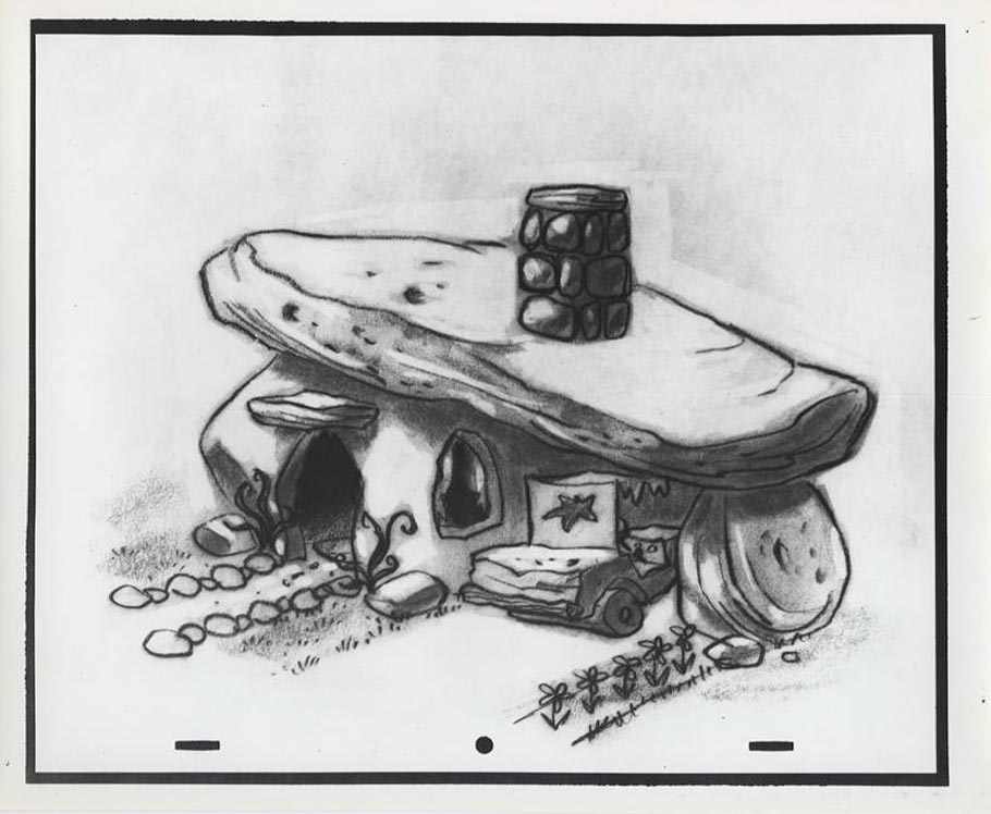 Benedict dreamt up the Flintstones homes almost entirely from imagination. He was once asked if he used any reference to design them. He replied, “No, with the exception of on the interior of one of the samples I made, I did look up some prehistoric stuff—cave paintings. I just looked up in there and got the old typical buffalo looking thing running across a wall, just to get the flavor of it.”